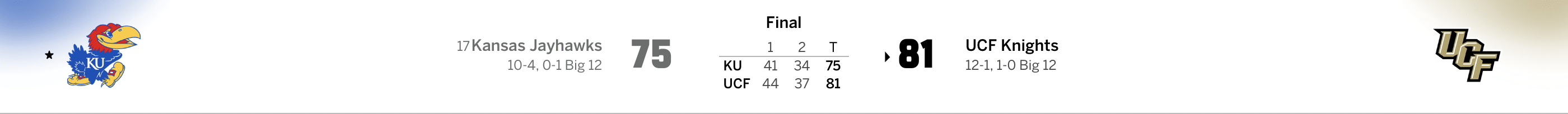 The Jayhawks fell to 10-4 on the season and 0-1 in Big 12 Conference play, while the Knights improved to 12-1 and 1-0 the league.