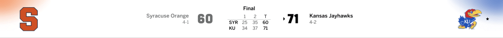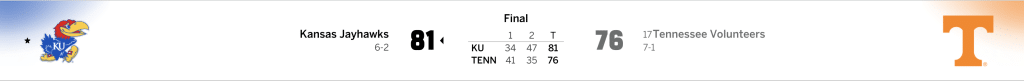 Kansas closed out the Players Era Championship with a strong performance, taking 3rd place after an 81–76 win over previously unbeaten Tennessee. The Jayhawks rallied through a physical, back-and-forth matchup, delivering poised execution late and locking in defensively when it mattered most. Kansas hit key shots down the stretch, controlled the glass, and found consistent scoring balance to outlast the Vols in Las Vegas. The win moves KU to 6–2 on the season